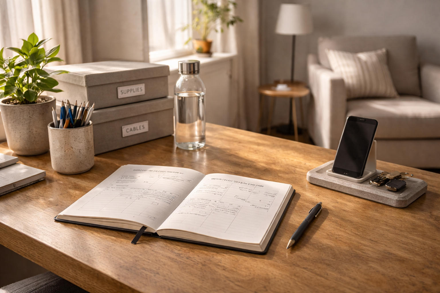 – Place items you use daily within arm’s reach and hide or remove distractions.